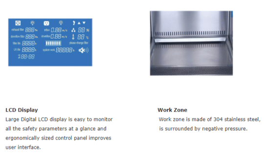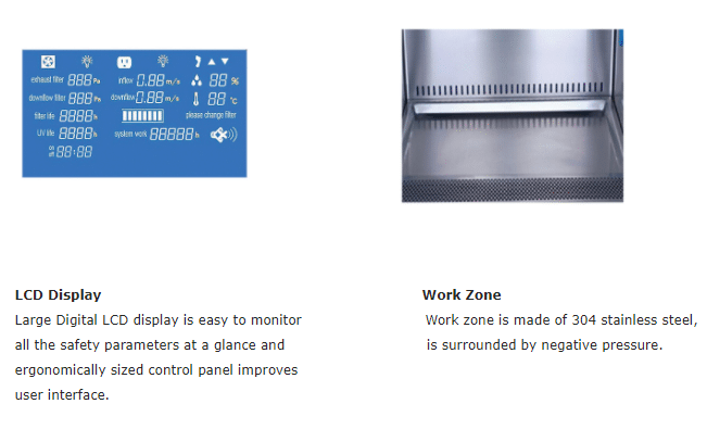 7. Large LCD display: Operators can check detailed status of the cabinet, such as inflow and downflow velocity, work area temperature and humidity, filter pressure, UV working time and filter working time, filter life indicator etc.